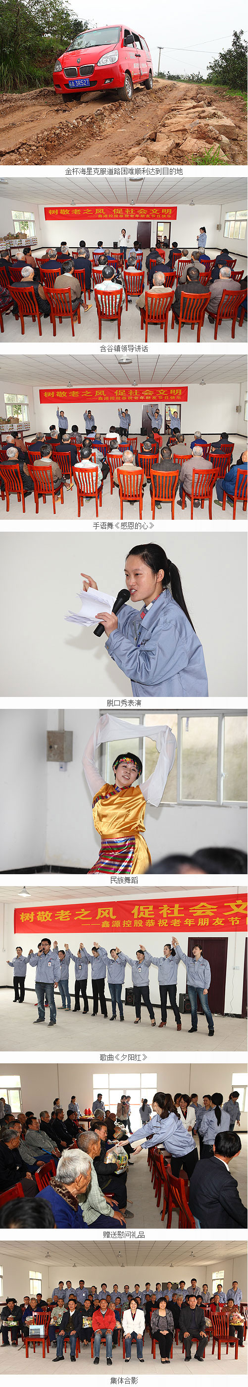 樹(shù)敬老之風(fēng) 促社會(huì)文明——尊老、敬老、愛(ài)老是中華的傳統(tǒng)美德。在得知本次活動(dòng)后鑫源公司大批員工踴躍報(bào)名參加,他們犧牲中午午休時(shí)間,認(rèn)真積極排練節(jié)目。10月19日一早,鑫源公司的文藝骨干們就高高興興踏上了前往寨山坪敬老院的征程。雨后的盤(pán)山公路特別顛簸,但是絲毫沒(méi)有影響到大家的熱情。到達(dá)目的地后,大家都積極搬卸慰問(wèn)禮品和對(duì)文藝表演大堂進(jìn)行了簡(jiǎn)單布置。在含谷鎮(zhèn)領(lǐng)導(dǎo)和鑫源公司外聯(lián)部曹部長(zhǎng)的開(kāi)場(chǎng)講話之后,鑫源文藝隊(duì)的隊(duì)員們就開(kāi)始亮相“演出”了。首先由手語(yǔ)舞《感恩的心》為表演拉開(kāi)了帷幕,隨后歌曲《好運(yùn)來(lái)》、脫口秀表演、載歌載舞的《卓瑪》、溫馨感人的《夕陽(yáng)紅》……沒(méi)有燈光,沒(méi)有舞臺(tái),大家都表演的非常認(rèn)真,每個(gè)節(jié)目都有板有眼,老人們也看得津津有味。