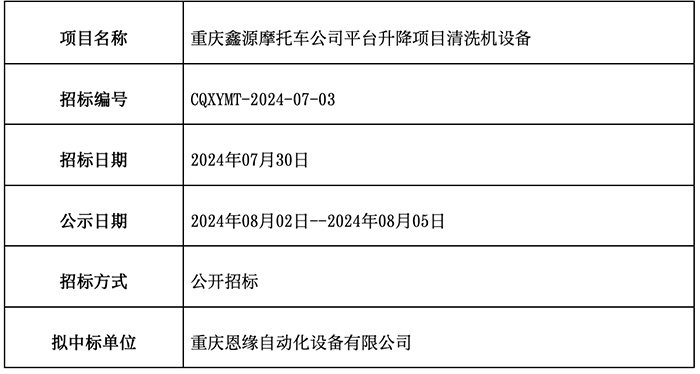 重慶鑫源摩托車(chē)公司平臺(tái)升級(jí)項(xiàng)目清洗機(jī)設(shè)備已完成招標(biāo)流程,現(xiàn)公示中標(biāo)結(jié)果如下: