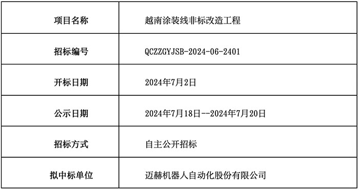 越南公司涂裝線非標(biāo)改造工程項(xiàng)目已完成開評標(biāo)流程,現(xiàn)公示中標(biāo)結(jié)果如下: